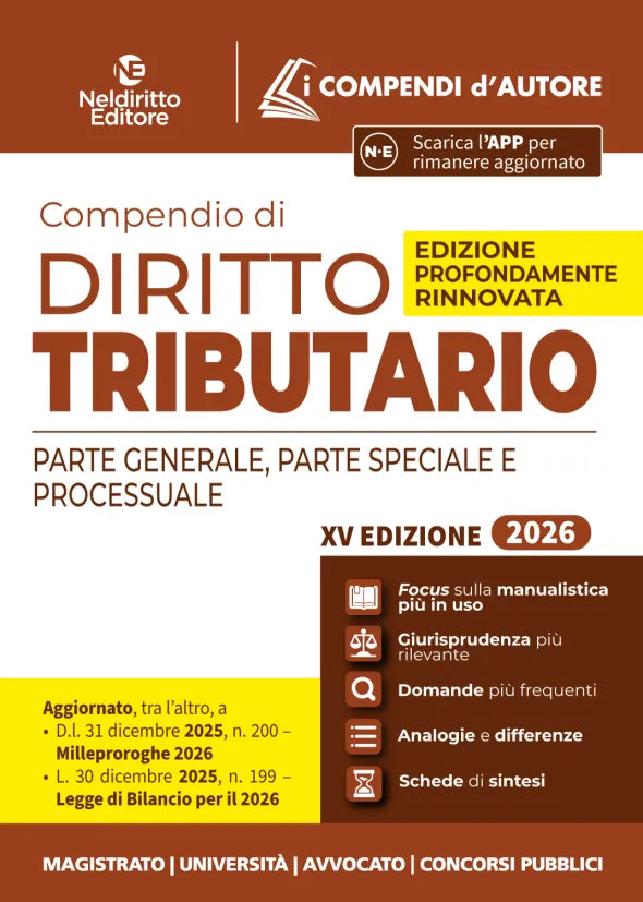 L’Edizione 2026 del Compendio di diritto tributario, Neldiritto Editore è stata profondamente rivista e aggiornata in considerazione delle numerose novità normative intervenute, tra le tante si segnalano: