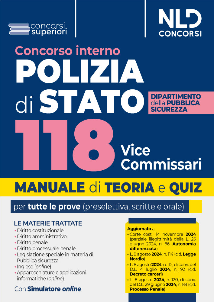 Il Ministero dell'Interno - Dipartimento di Pubblica Sicurezza ha indetto il concorso interno, per titoli ed esami, per la copertura di n. 118 posti per la qualifica di Vice Commissario della carriera dei funzionari di Polizia di Stato.La procedura concorsuale si articola in una prova preselettiva, due prove scritte e una prova orale.NLD Concorsi ha predisposto il Manuale Ministero dell'Interno - Dipartimento di Pubblica Sicurezza - 118 Vice Commissari di Polizia di Stato, Teoria e Quiz, per venire incontro alle specifiche esigenze di chi deve prepararsi ad affrontare le prove concorsuali.Il Volume si caratterizza per una trattazione completa, aggiornata e, al contempo, schematica e fluida, delle seguenti materie: