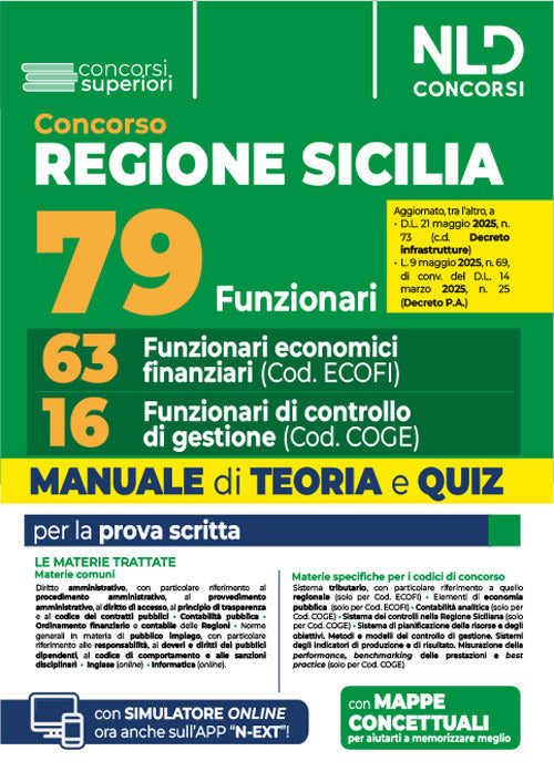 La Regione Siciliana – Assessorato regionale delle autonomie locali e della funzione pubblica – ha indetto un concorso pubblico, per esami, per il reclutamento di: n. 63 unità di personale non dirigenziale, a tempo pieno e indeterminato, di categoria D – profilo professionale Funzionario economico Finanziario (Cod. ECOFI), posizione economica D1; n. 16 unità di personale di categoria D, profilo professionale Funzionario di controllo di gestione (Cod. COGE). La procedura concorsuale è affidata ad una unica prova selettiva scritta. Il Manuale Regione Sicilia. 79 Funzionari. Teoria e quiz, NLD Concorsi, 2025 viene incontro alle specifiche esigenze di chi deve prepararsi ad affrontare la prova concorsuale di entrambi i profili. Il Volume contiene, infatti, tutte le materie comuni e quelle specifiche per ciascun codice di concorso. Di seguito, così come all’interno del Volume, si indica tra parentesi, per ciascuna materia, se si tratta di materia comune (MC) ovvero di materia richiesta dal bando per l’uno o l’altro profilo. Il Volume si caratterizza per una trattazione completa, aggiornata e, al contempo, schematica e fluida delle seguenti materie: Diritto amministrativo, con particolare riferimento al procedimento amministrativo, al provvedimento amministrativo, al diritto di accesso, al principio di trasparenza e al codice dei contratti pubblici (MC); Contabilità pubblica (MC); Ordinamento finanziario e contabile delle Regioni (MC); Norme generali in materia di pubblico impiego, con particolare riferimento alle responsabilità, ai doveri e diritti dei pubblici dipendenti, al codice di comportamento e alle sanzioni disciplinari (MC); Sistema tributario, con particolare riferimento a quello regionale (solo per Cod. ECOFI); Elementi di economia pubblica (solo per Cod. ECOFI); Contabilità analitica (solo per Cod. COGE); Sistema dei controlli nella Regione Siciliana (solo per Cod. COGE); Sistema di pianificazione delle risorse e degli obiettivi. Metodi e modelli del controllo di gestione. Sistemi degli indicatori di produzione e di risultato. Misurazione della performance, benchmarking delle prestazioni e best practice (solo per Cod. COGE); Inglese (MC online); Informatica (MC online). Il Volume tiene conto delle principali novità normative, tra cui quelle introdotte dal D.L. 21 maggio 2025, n. 73 (c.d. Decreto infrastrutture) e dalla L. 9 maggio 2025, n. 69, di conv. del D.L. 14 marzo 2025, n. 25 (c.d. Decreto P.A.). Per consentire di affiancare allo studio teorico una immediata verifica della acquisita capacità di risolvere i corrispondenti test, il Manuale presenta quiz di verifica suddivisi per ciascuna Parte o per singoli Capitoli che compongono le indicate materie. Il Manuale permette, infine, l’accesso ad un’estensione online, consultabile con apposita password, per rimanere aggiornati sulle materie oggetto d’esame, per accedere alle mappe concettuali e per esercitarsi con il simulatore online.